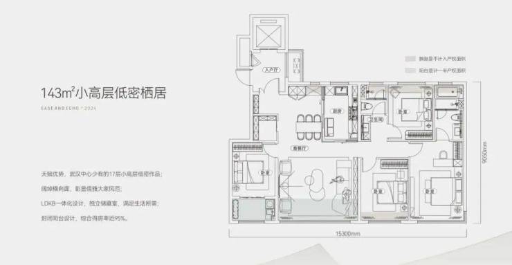 143㎡精致小高层,尊享四室两厅两卫布局,南向观景面宽达15.3米;四开间均朝南,客厅宽敞开间约5.4米;配备约2.1米进深阳台,双阳台设计搭配全赠送的飘窗,实现高达约95%的优化得房率。此外,含约6.6㎡电梯前室,得房率进一步提升至99%,空间利用最大化。