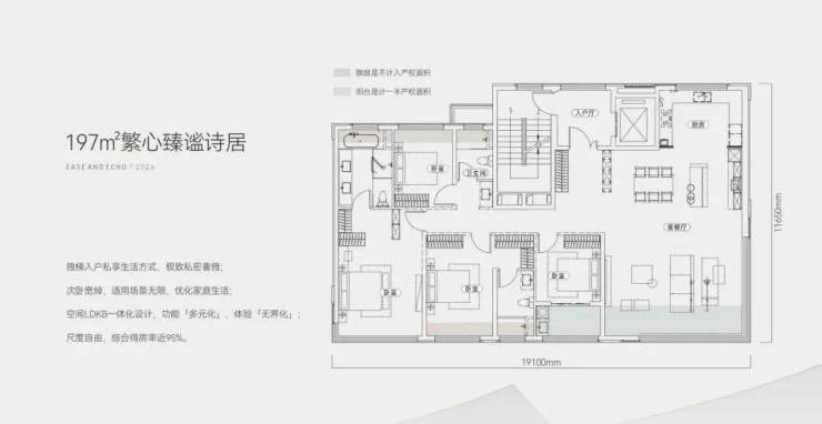 武汉稀缺独梯入户一层一户大平层,11层建筑中,实际仅10套珍稀房源。197㎡宽敞户型,配备四房两厅三卫,独具匠心的双套房布局;南向超宽面达19.1米,四面环绕采光与通风,居住舒适度极佳;阳台深度约2.4米,配备双阳台及多个飘窗,优化空间布局,实现高达95%的得房率,计入电梯前室面积,得房率可逼近99%。