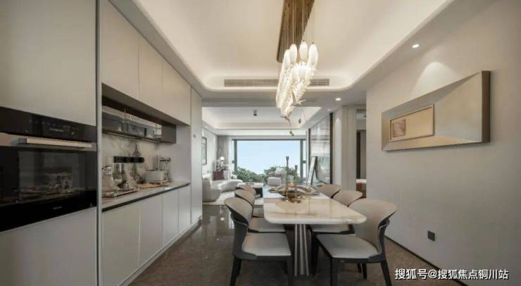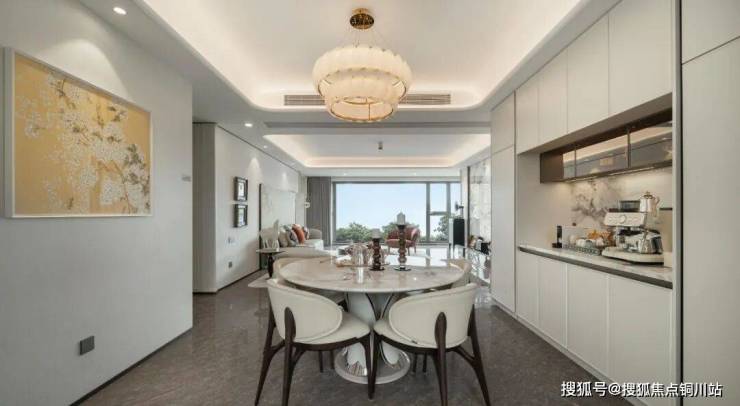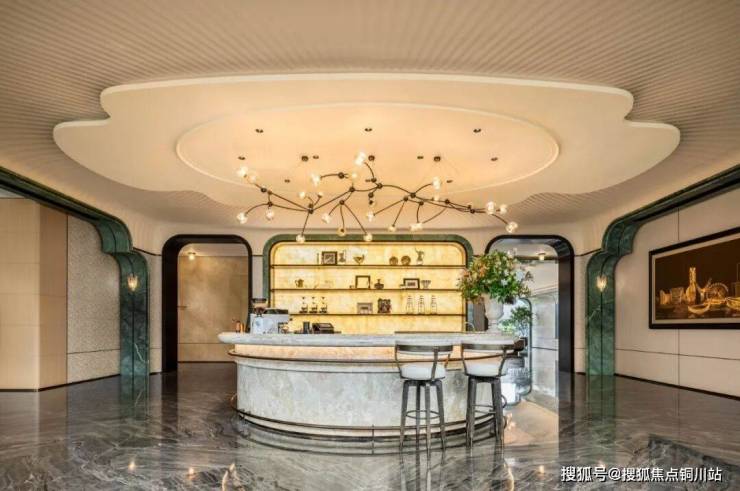 水吧区位于生活馆核心位置,自然衔接沙盘区与洽谈区。圆弧形水吧台引导行走动线,同时又能提高服务效率。浅灰色奢石与枝形吊灯相得益彰,高贵又不失亲和力。