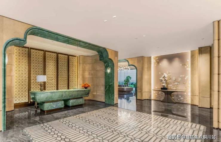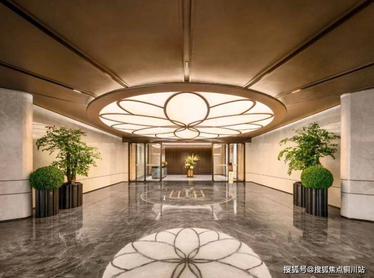 主入口极尽门庭奢礼。全长约42m的超宽门庭,迅速攫住人们的视线。设计提炼百合元素,大尺度雨棚由8根巨型花瓣柱阵列托起,200多片百合花瓣组成的金色吊顶之下百合雕塑熠熠生辉。一扇玉石大门静待开启。