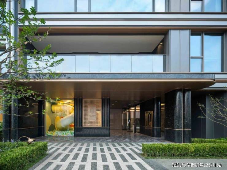 主入口融合多种奢华石材,景墙搭配金属格栅,两侧水景底部铺设黑色奢石,并点缀进口幻影蓝奢石和白雪公主玉石。门庭两侧铁冬青、丛生朴树对称而列,彰显尊贵礼序。