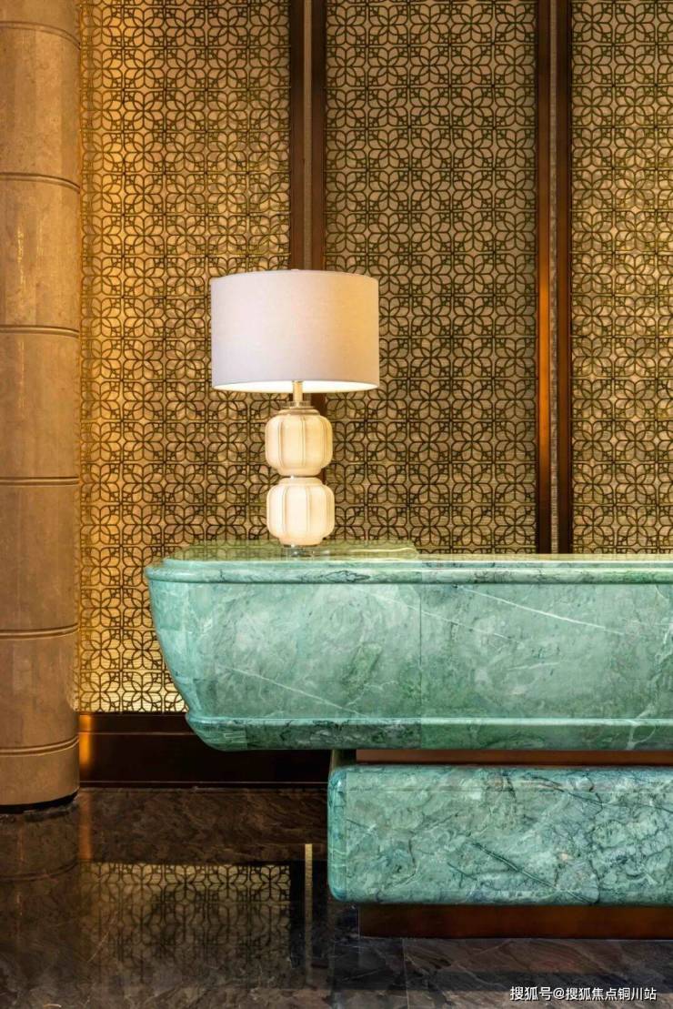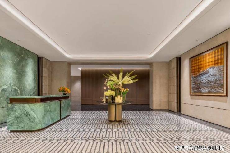 生活馆接待区采用黑白复古几何铺地,天然青绿奢石接待台搭配百合花镂空纹样屏风作为背景,奠定空间清新雅致的整体基调。地下会所接待大堂亦采用相同的设计语汇,搭配装饰画与艺术品,呈现光影归家雅境。