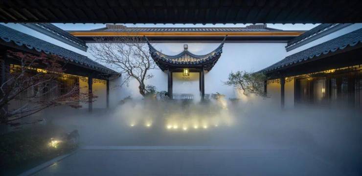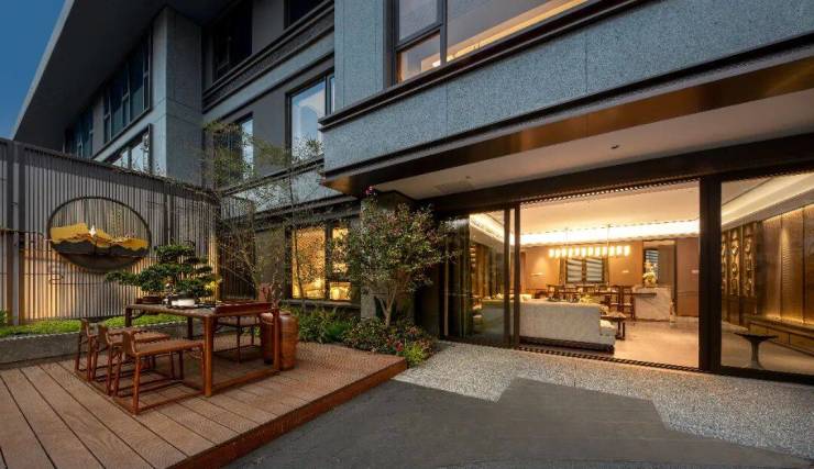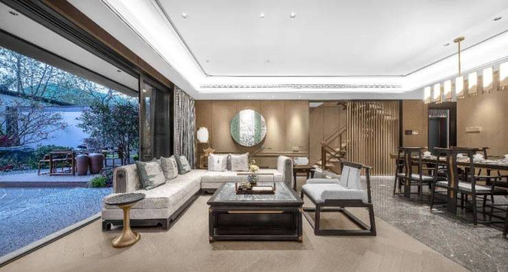 纵观湖山院墅的设计,融合古典精致与现代简约,创造出了有天有地的中式空间格局,同时又充分尊重现代人的审美需求和用材理念,利用玻璃、铝板等营造出了轻盈、雅致、大气的建筑风格。并以轩敞厅堂为中心,与其他生活空间构成续连,促成氛围的通融平和,以孕家境澄澈之气,真正将具有高雅意趣但又不离烟火日常的东方哲学展现得淋漓尽致。