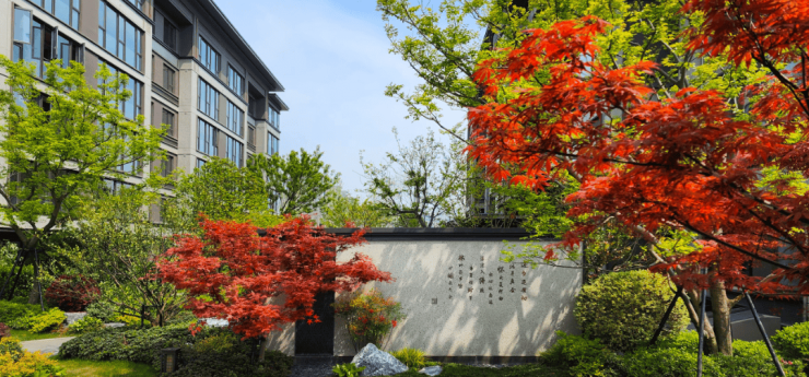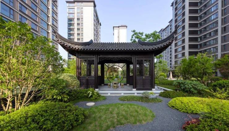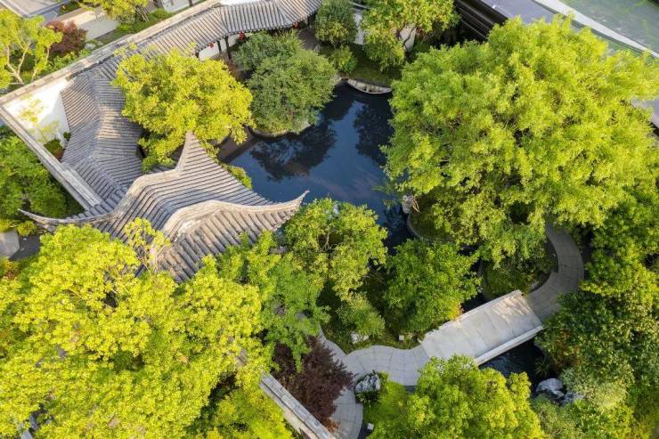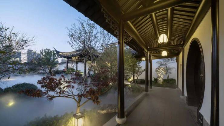和玺园林师法中国四大名园之一的拙政园,并特邀非遗传承人“香山帮”参与园林的营造,依循门、堂、园的三进脉络,于府门打造恢弘九脊顶乾元门,两侧照壁融入千里江山图卷,并佐以榫卯、华纹点缀;