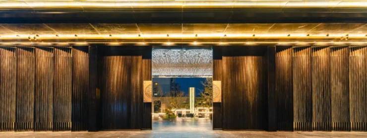 特别震撼的莫过于重金打造的约50米显赫门庭,恢弘气派,材料考究。约9米定制紫铜大门由非遗匠人手工锻造,气势巍峨恢宏。两侧通顶格栅搭配保加利亚灰岩板,呈现出偏内敛的贵感,豪中透雅;地面回形纹铺装,寓意富贵不断、吉利永长;屋檐勾勒云纹环绕,每一处细节极尽匠心,删繁就简。
