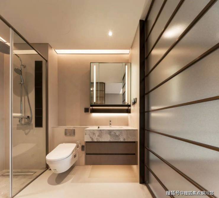 两侧的仿奢石岩板形成灯光矩阵,简约大气的配色,兼具层次感和美感。