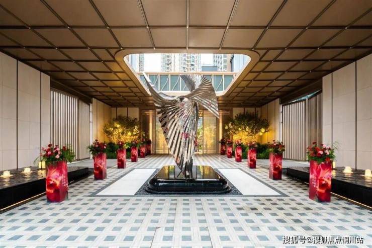 红毯铺陈归程,繁花缀饰门庭。从解放大道步入小区,迎接他们的是高级大气的社区大堂。具有艺术感的雕塑,奢石背景墙,地面拼花石材……审美在线,用材考究,大堂媲美星级酒店。