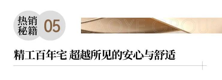 承袭宝业“百年宅”品牌基因和装配式建筑精工,构筑更坚实、隔音度、保温度、防水性、舒适度更高的百年作品。 计算机构件智造让建筑的每一个构件精密至毫厘,玻璃幕墙+铝板线条公建化外立面,密会级三玻两腔玻璃, 约13厘米厚楼板,颠覆传统“轻砖砌筑”外墙工艺的钢筋混凝土墙板,精工细节超越市场所见。