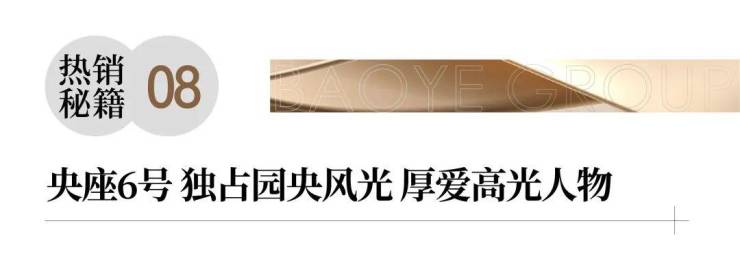 央座6号,居于园央正席,是距离璞园所有精华奢配最近的一栋。在轻松享有宝业璞园精华生活的同时,以难以复制的极致视野、风景、楼间距,厚爱每一位,值得拥有它的人。