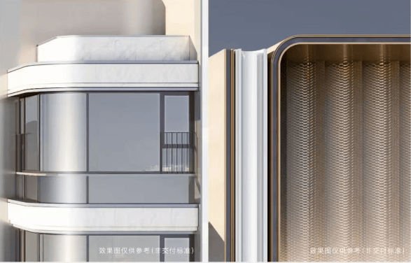 其一,270°转角弧形飘窗的创新,超绝的窗墙比造就空中全景舱。弧面玻璃都是三玻两腔,造价高昂。其二,在建筑层间用弯弧铝板来勾勒线条,工艺复杂、成本昂贵,楼体铝板也是弧面设计,并且整体大面运用滚涂工艺,色彩鲜艳、防腐性能好、耐气候性也更好,豪宅气质更加历久弥新!