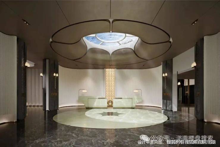 ▶ 藏纳时代风云的单元门厅以百合弧形的线条演绎:结合深绿石材,构筑 “藏风聚气”祥瑞格局