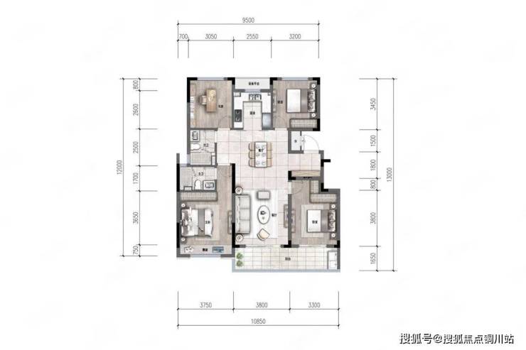 点评:南向面宽做到了13.9米,带6.9米的大横厅和大阳台,无界限的空间感和无遮挡的景观视野真的是好。而且除主卧外的其他房间开间都在3米以上,面积都超过10平方,都可以作为卧室来使用,功能性非常强。