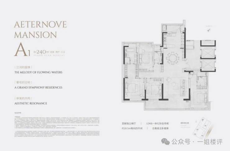 建面约240平 四房三卫:通透性非常好,比如主卧南北贯通,动区与厨房南北贯通等;这个户型还做了四开间朝南,其中两个套房及一个次卧都是朝南的设计,南向约16.5米的开间面,这夸张的采光面也是观江面,确实很震撼,再与约3.3米的层高一结合,视野更好;南向阳台开间也很赞。