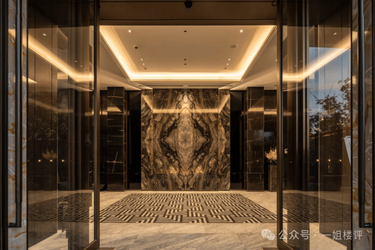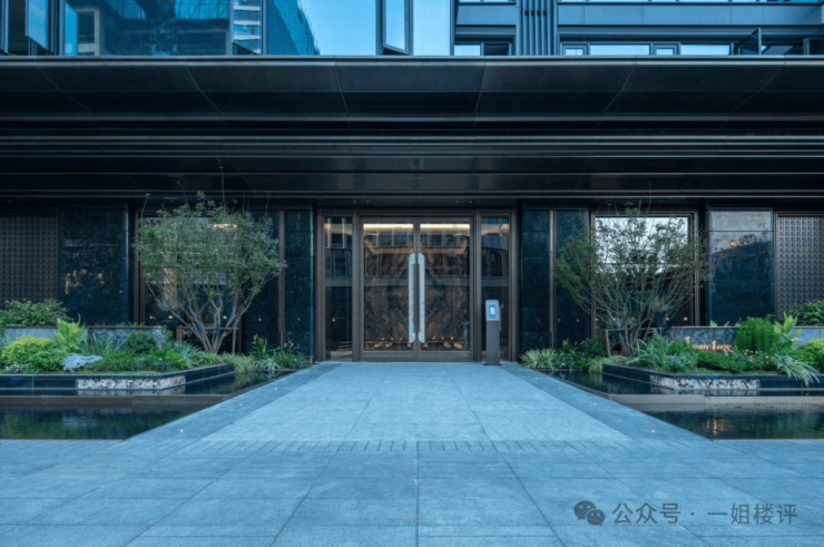 1号楼入户门楣两侧做了对景设计,也有水景与名贵树种等。