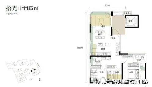 建面约115平的边套三房:分布在1号楼端头边户,3个卧室朝南,餐客厅一体全景舱设计,带独立电梯前室。