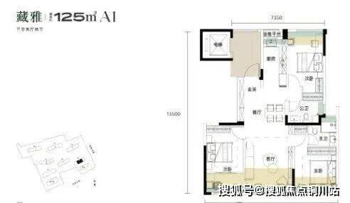 建面约125平单元拼接处户型:位于1号楼单元拼接处夹边户,三房两厅两卫,4个主要空间均带阳台+花池优化面积,三房设计,带独立电梯前室,结构相对比较常规。