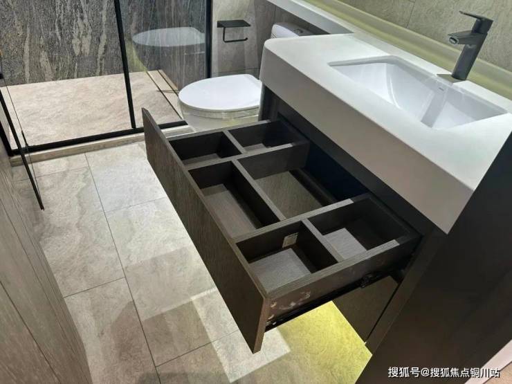 今年亮相的全新盘都在卷镜柜收纳,而天津瑞府二期的浴室柜却走在了时代前面,两个抽屉均为分格收纳。