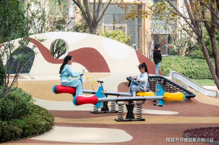 儿童活动区的地面同样为塑胶材质,除了滑梯、跷跷板、摇摇马等游乐设施外,还设置了户外休闲坐凳和亲子洗手台。