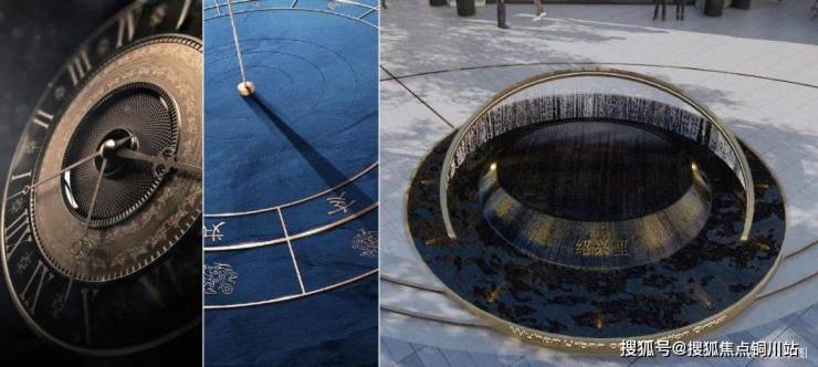 时 光之环: 在转角广场与建筑入口对应的轴线上,我们设计了"时光之环"特色水景,从钟表与日晷中汲取灵感,将环形与刻度的元素融入水景之中,研究并寻找了具有时代代表性的 12个里分社区,将这些特色里分与建造年份刻于12个刻度处,来铭记和体现时代的印迹,水景的形体构成上通过立体交织的三个圆环寓意时光的轮回与永恒。