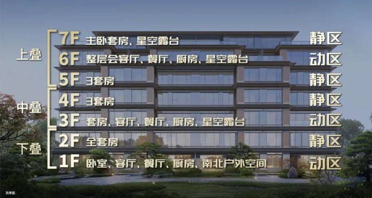 颠覆型户型,高净值圈层共识。建面约180-300㎡的叠加产品,更是以“垂直四合院”理念引发市场惊叹。