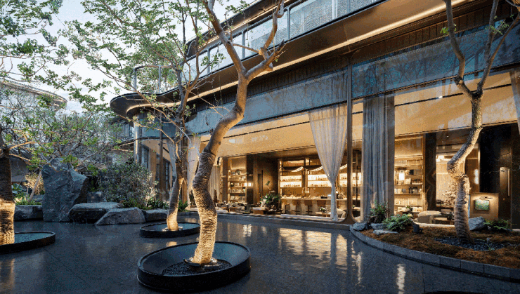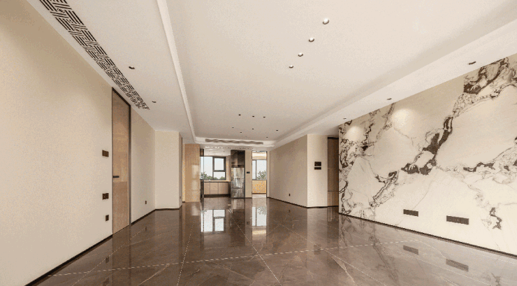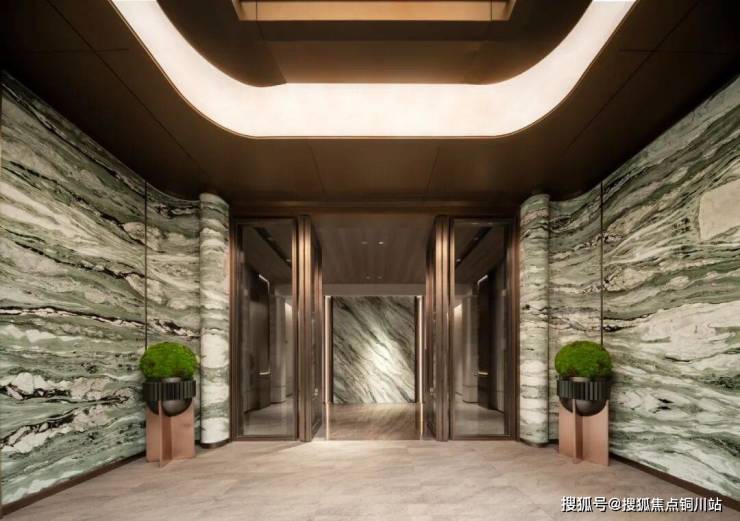 高奢酒店般的入户门厅,舒展的铝板飞檐、维多利亚奢石、透光云石背景墙,与温暖的灯光一起,给你的回家之路洒满星光。