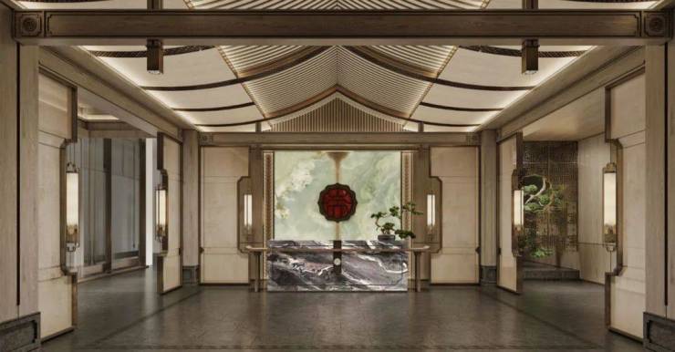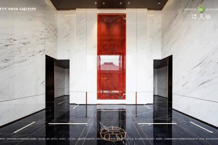 于外是云龙山水的环绕,于内是皇家工艺的雕琢。小区主入口为三启门,取自古制诸侯仪轨,单檐庑殿顶再现东方建筑威仪;外立面采用徐州难得一见大面积铝板+玻璃幕墙,流线造型暗合云龙湖波光纹理;设计团队七易其稿,终将李可染"万山红遍"的恢弘意境,凝练为入户大堂整块巴西奢石"盛世红颜"的惊鸿一瞥。