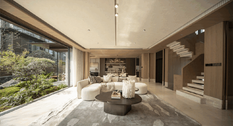 LDK一体化无界社交宽厅,巧妙串联餐厅、客厅、厨房,突破常规尺度与想象边界。室内与庭院景致无缝相连,生活与自然融为一体,尽显大气雍容。