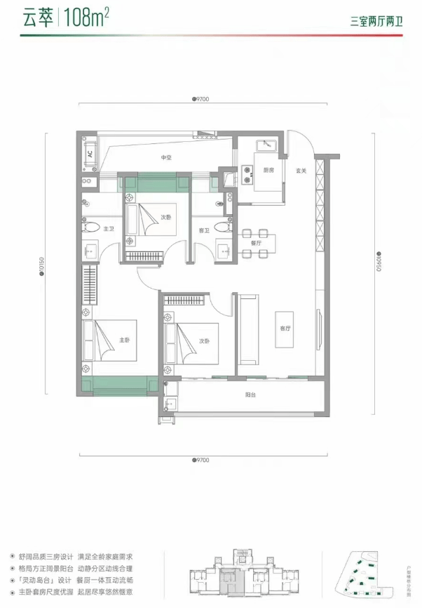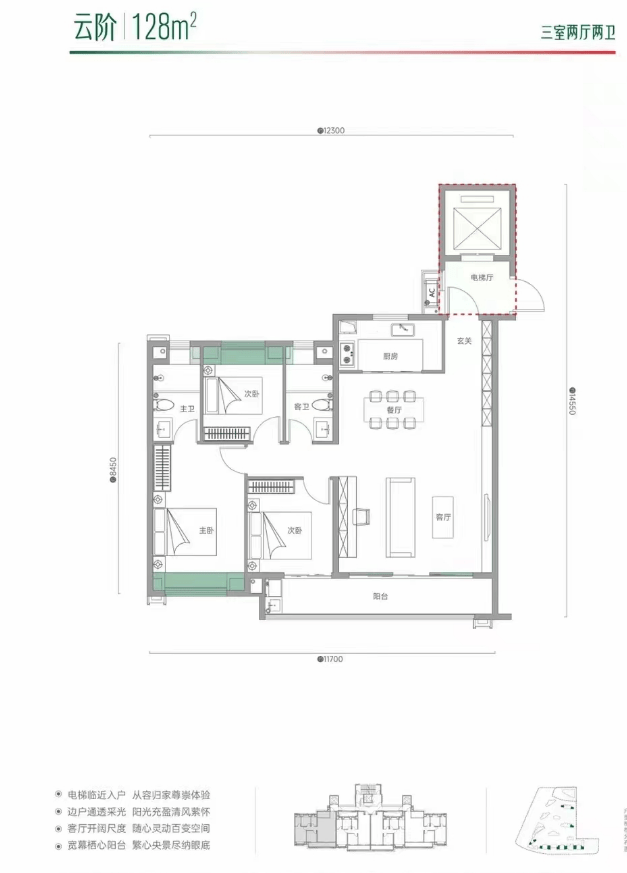 根据户型分布平面图来看,该户型所在楼栋为3梯4户格局,双连廊设计,该户型位于楼栋边户,南北通透,三开间朝南,南向有连接次卧和客厅的大阳台;户型比较方正且动静分区较好,但是过道有点浪费面积,另外根据户型图显示,该户型可以做到一梯一户的居住体验。