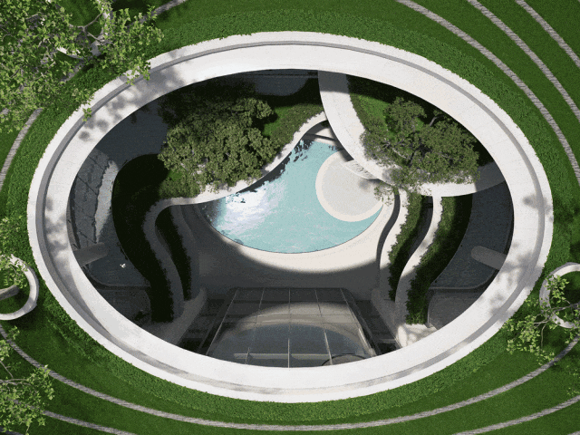 以C2地块为例。地下二层的地库与片区整体地下环路相连,部分停车位向城市开放。市民可经由公共车库、地下多功能厅的路径,或是通过沿街主入口,抵达各共享空间。艺术中心主入口设在沿街面,由8根白色UHPC树形立柱阵列支撑,形成10.5米挑高的视觉引导与标志性空间。