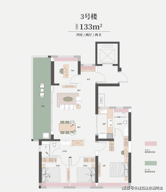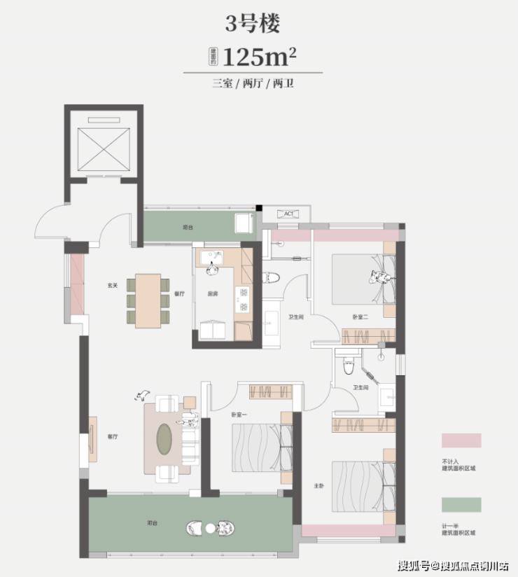 建面约125㎡三房两厅两卫,相对于传统住宅,这个户型最大的特点是,所有卧室是真正的卧室,其中两个次卧都能成为独立的卧室,并预留了合理的收纳空间,实现真正的三代同堂。