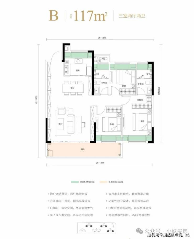 建面约117㎡边户,不仅能做到3+1的成长户型,横厅尺度达到约5.1m,堪比传统138㎡产品;