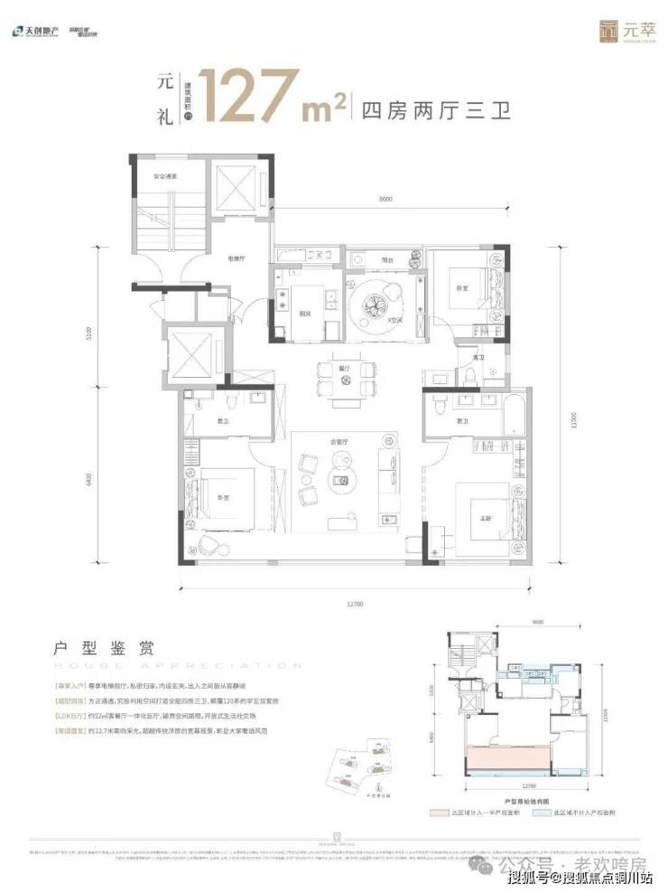 建面约127㎡四房两厅三卫,南向面宽12.7米,三开间朝南,52㎡客餐厅一体化,含独立电梯前室与阳台花池可拓展空间,实际使用面积堪比市面140㎡+产品,性价比突出。