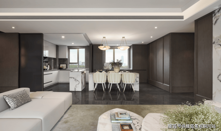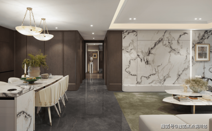 室内美学追求极致,客餐厅地面选用900×1800mm简一大理石瓷砖,以连纹密缝铺贴达成整体视觉延伸,提升空间开阔感。