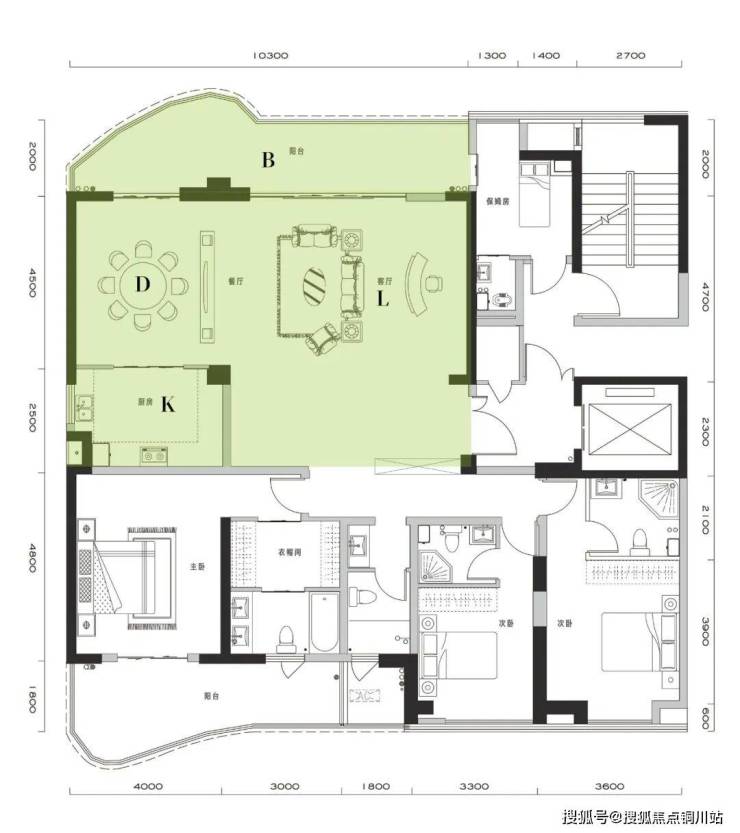 LDKB一体化设计,将客厅(Living room)、餐厅(Dining room)、厨房(Kitchen)、阳台(Balcony)四个相对独立的空间整合到一起,成为超阔绰的公共活动空间。这一空间即便是不把阳台计算在内,也超70平米,相当于一个普通小两房的空间大小。约10.3米的大横厅设计直接连接北向弧形阳台,让整个空间格外通透。