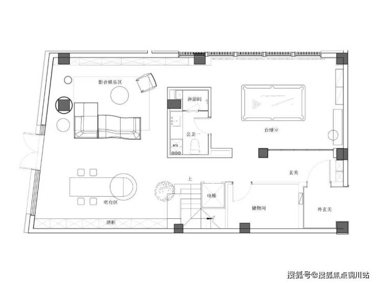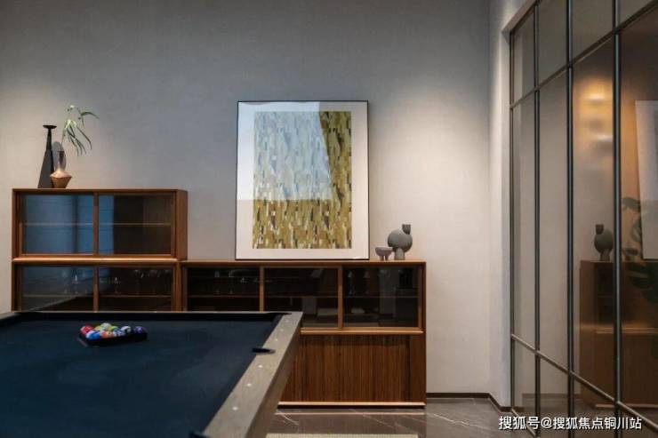 负一层设置影音室、台球休闲区、吧台区,采光通风良好,为日常休闲娱乐社交场所。