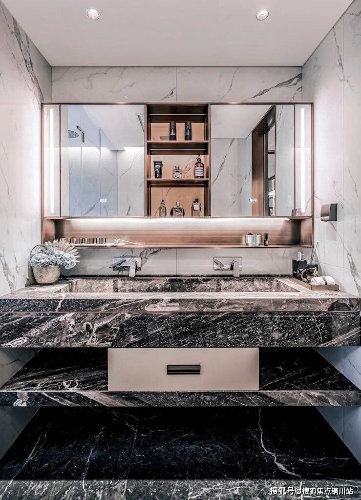 深墙大院、会客厅里的泳池以及样板间里,给每一位到访者留下深刻的印象:客厅主背景墙上,超大面积“翡翠级奢石”。主卫双台盆一体化台面,由上吨重的整块石材切割成型……