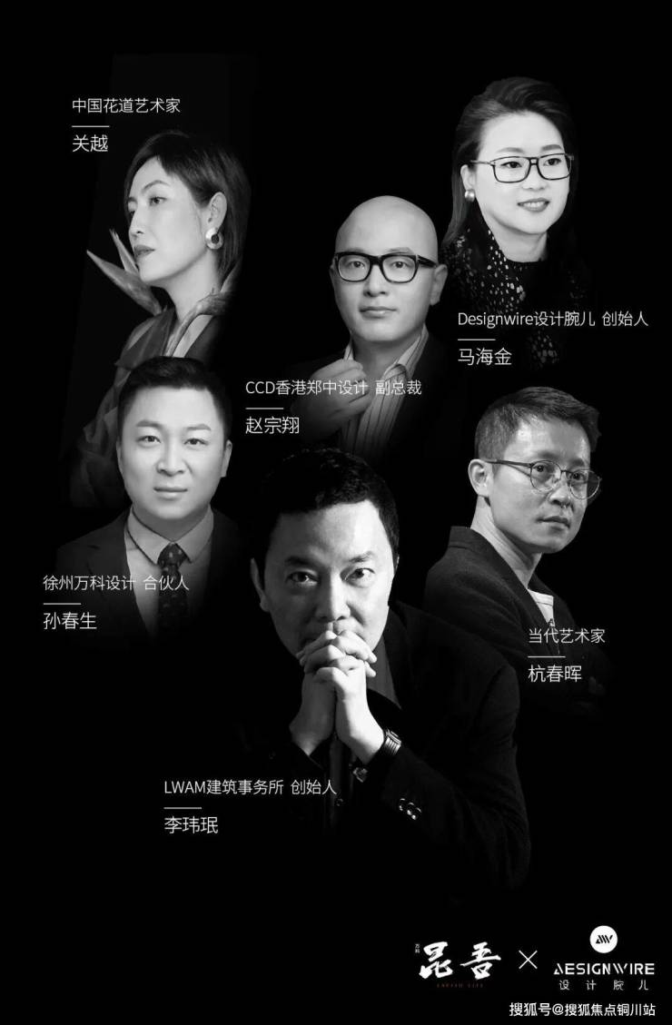 左起:CCD香港郑中设计副总裁赵宗翔,中国花道艺术家关越,徐州万科营销片区总监王海荣,Designwire设计腕儿创始人马海金,LWMA李玮珉建筑事务所创始人李玮珉,中国当代艺术家杭春晖,徐州万科第四事业群总经理张灿,徐州万科设计总监孙春生
