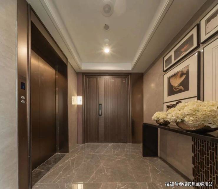 步入仪式单元入户门厅,迎面景墙以沉稳石材配精致金属细节,石材花基衬出归家标识。人脸识别、楼层梯控加持,归家安全又优雅。