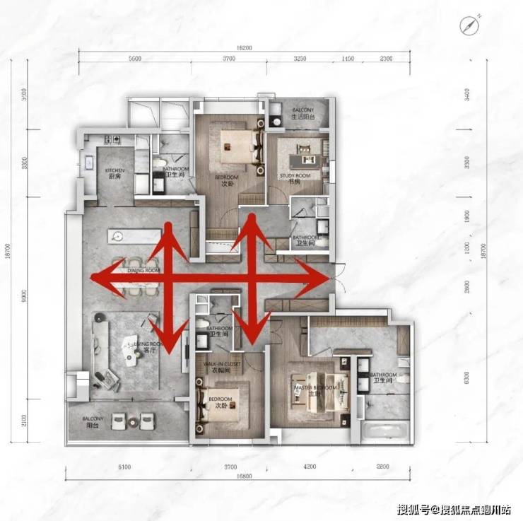 该户型利用少见的「双十字型动线」,其中第一个十字型动线横向串联起玄关、走廊,纵向串联起两个起居室、书房、卫生间;而第二个十字型动线则横向串联起走廊、餐厅,纵向串联起厨房、客餐厅及观景阳台。