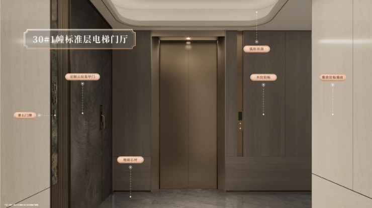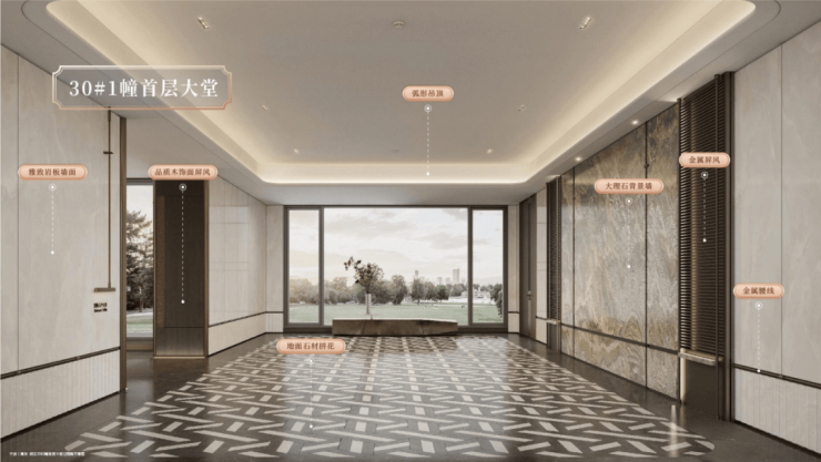 • 高定归家车坡道:车库入口地面为加厚石材,墙面使用大规格岩板及金属墙裙,顶面定制中式天花,随着车辆缓缓使用,线型灯光依次打开,每一刻都迎接业主归家。