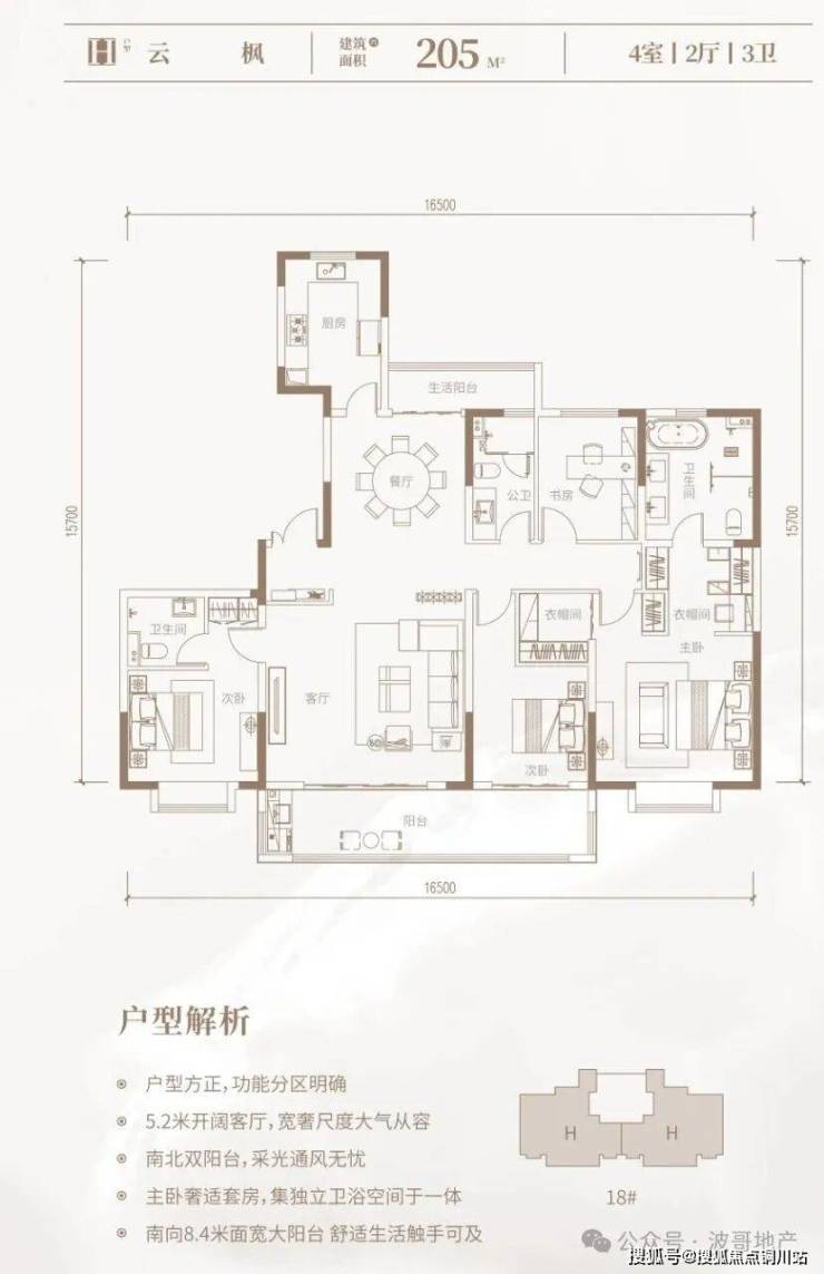 H云枫205㎡四房两厅三卫:此户型分布在18号楼、2梯2户布局。南向开间(宽)约16.5米、进深约15.7米;四开间朝南,南向双套房设计,南北双阳台,南向阳台宽约8.4米连通卧室,客厅开间约5.2米。