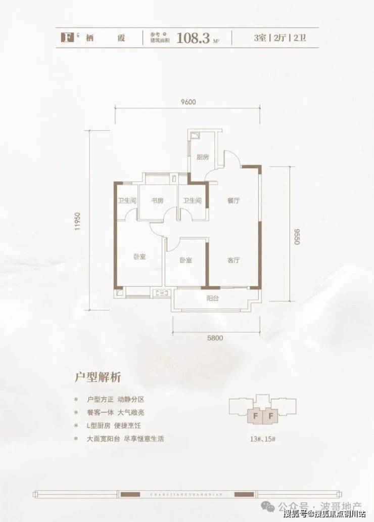 F栖霞108㎡三房两厅两卫:此户型分布8、9、12A、12B、13、14、15、16号楼;三梯四户布局中间户型,北面连廊连接接;常见三开间朝南、动静分区设计,南向大阳台连通次卧宽约5.8米。