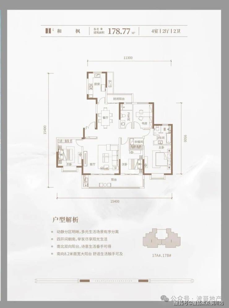 I和枫178㎡四房两厅两卫:此户型分布在17A、17B,2梯2户布局。南向开间(宽)约15.4米、进深约15.4米;三间卧室均朝南,南北双阳台设计,北向阳台封闭交付;南向阳台宽约8.2米连通卧室,客厅开间约4.8米,整体户型功能性不错,但户型不方正像楼梯。