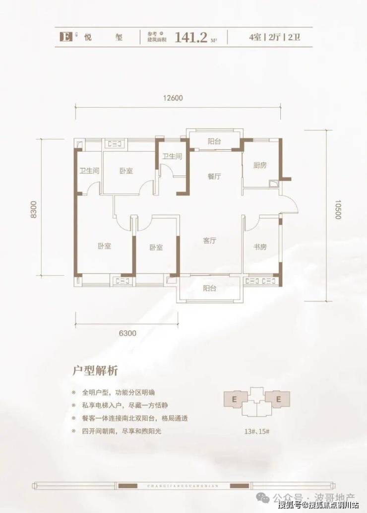 E悅玺141㎡四房两厅两卫:此户型分布8、9、12A、12B、13、14、15、16号楼;三梯四户布局东西两端边户户型、拥有独立电梯前室;南北双阳台设计,户型方正通透。户型开间(宽)约12.6米,进深约10.5米。