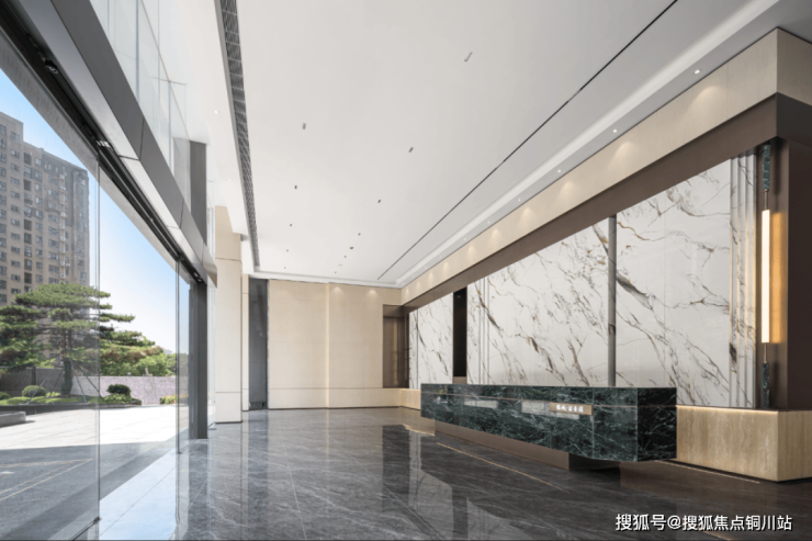 大堂两侧,采用的是干挂石材,并大面积奢配整版白玻,稀有且贵,但绝不花哨