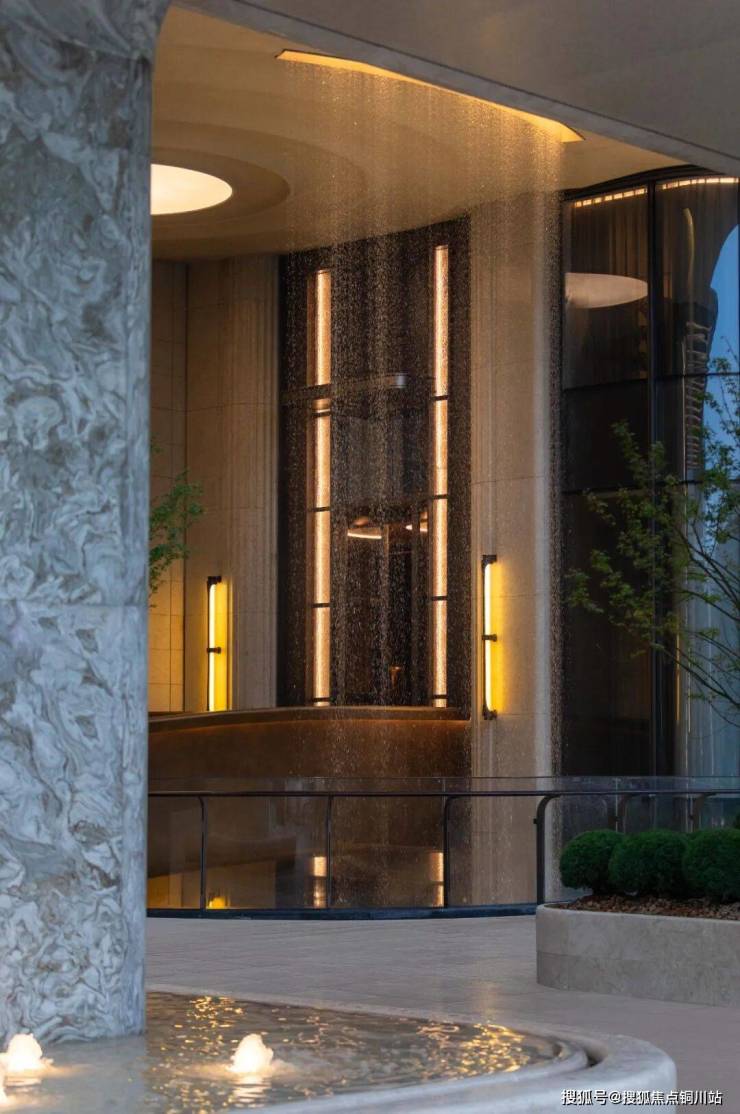 其 C 位处,30 米恢弘门头与 8.5 米大堂外门吊顶相映成势,最令人惊艳的是 13 米落差的建筑瀑布,水流在阳光下倾泻,裹挟着负氧离子奔涌而来,灵动而亲切。