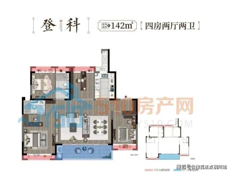 建面约142㎡四房两厅两卫户型,格局方正,使用率高达85%。