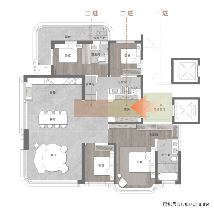 192㎡户型的“三进式”设计,正是对这一系列高阶追求的精准回应: