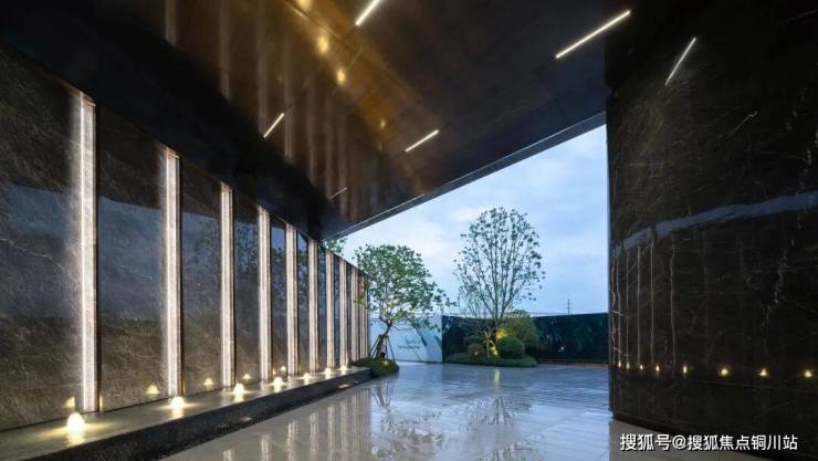 强调品质与细节的前场景观揭开了归家序幕。迎宾涌泉在水面泛起涟漪微波,爱马仕灰大理石景墙与精致品牌案名在材质质感、肌理等方面形成多重对比,共同构成一幅相得益彰且有张力的归家画卷。爱马仕灰大理石搭配极具质感的仿铜色造型铝板肌理,结合暖黄色灯光流泻,充分彰显精奢雅致的归家礼序,营造定制化的归家场景。