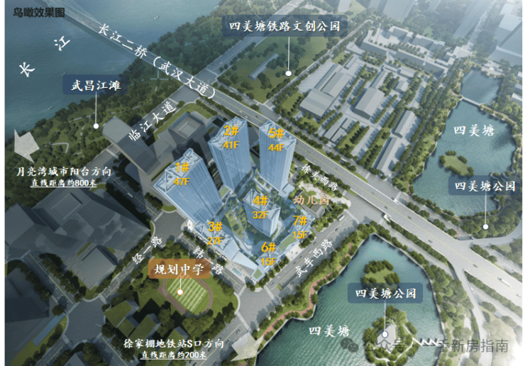 项目位于长江畔,背靠四美塘,有月亮湾城市阳台、四美塘公园、四美塘铁路文创公园、武昌江滩公园、新中央公园(规划)等五园环绕,人文生态体系景色宜人,天然城市氧吧,生态宜居。